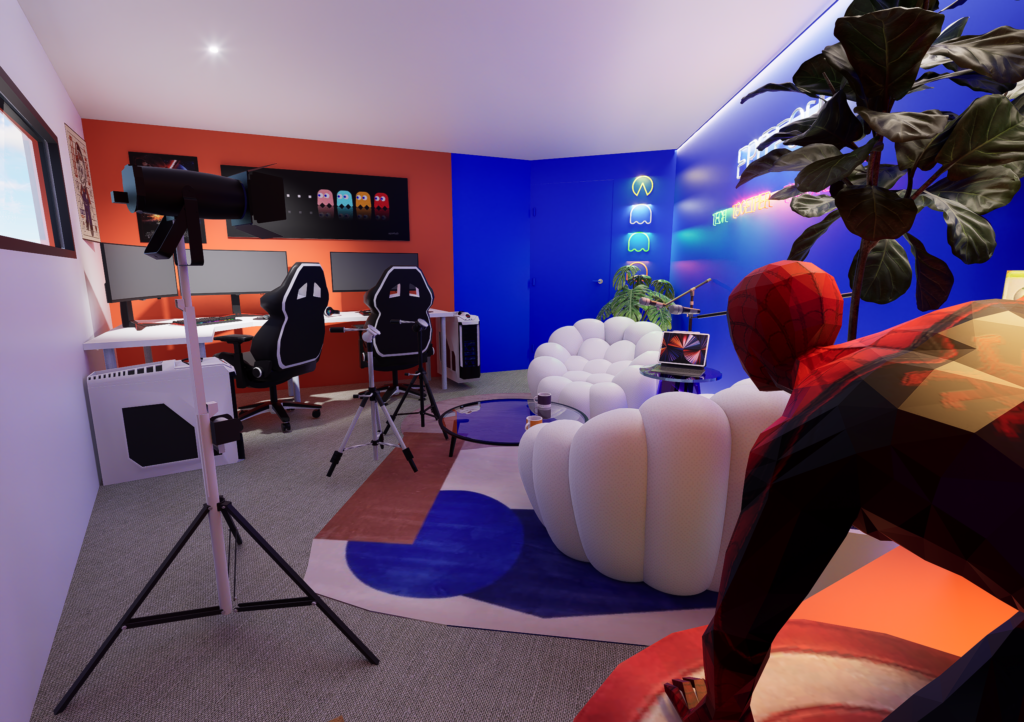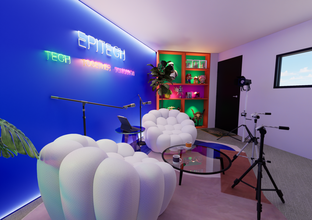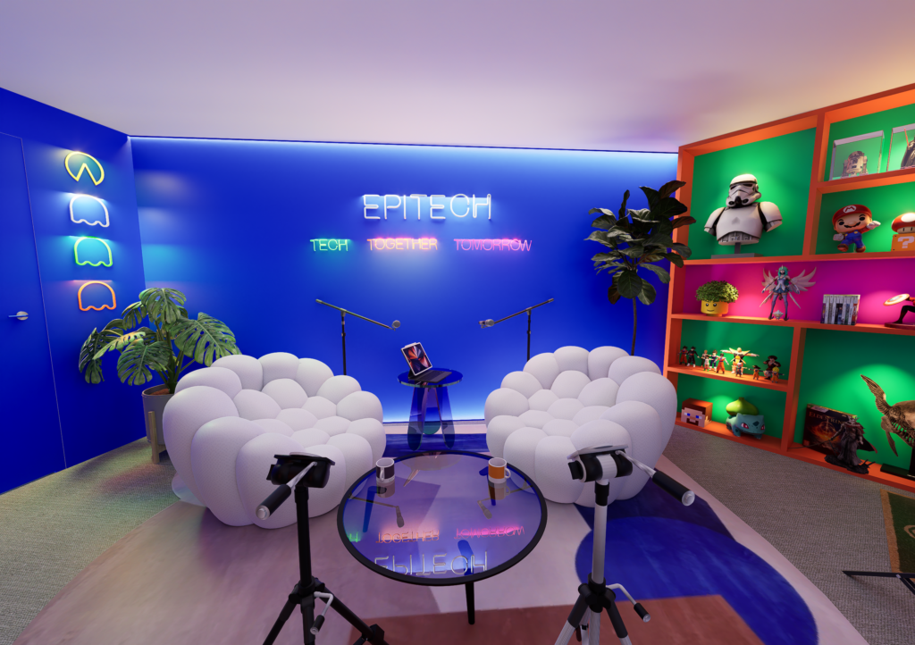 Dans le cadre de ce projet, j’ai été sollicitée par Epitech, une grande école d’informatique reconnue, pour concevoir un espace polyvalent dédié au gaming, aux interviews et au streaming.